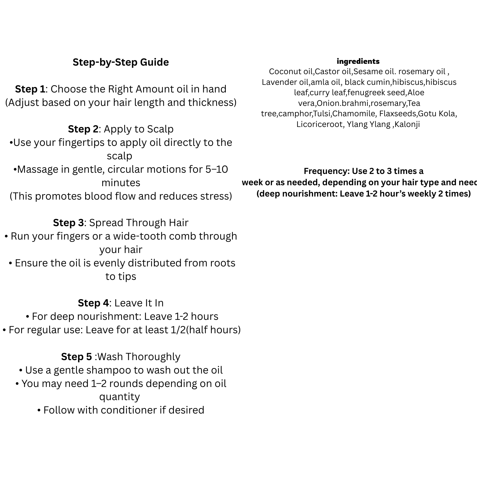 Coconut oil, Castor oil,Sesame oil,rosemary oil , Lavender oil,amla oil,black cumin,hibiscus,hibiscus leaf,curry leaf,fenugreek seed,Aloe vera,
